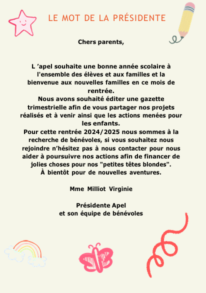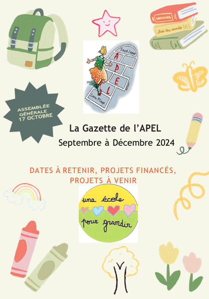 Le comité de l’APEL est l’association des parents d’élèves de l’école, qui aide activement à la réalisation des projets (fêtes, sortie, kermesse…) et qui participe également au financement de matériel pédagogique (livres, matériel ludique…).